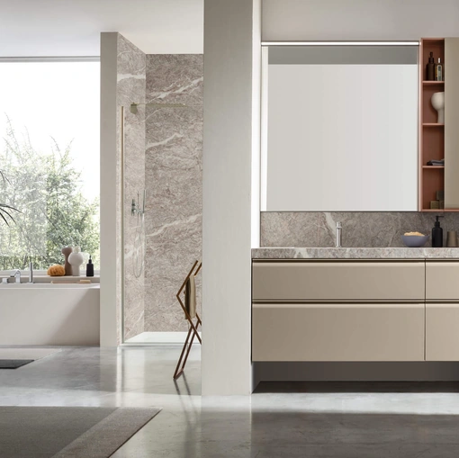 Arreda il tuo bagno moderno al meglio con Libera+ 08, mobili bagno sospesi e accessori in HPL di Novello.